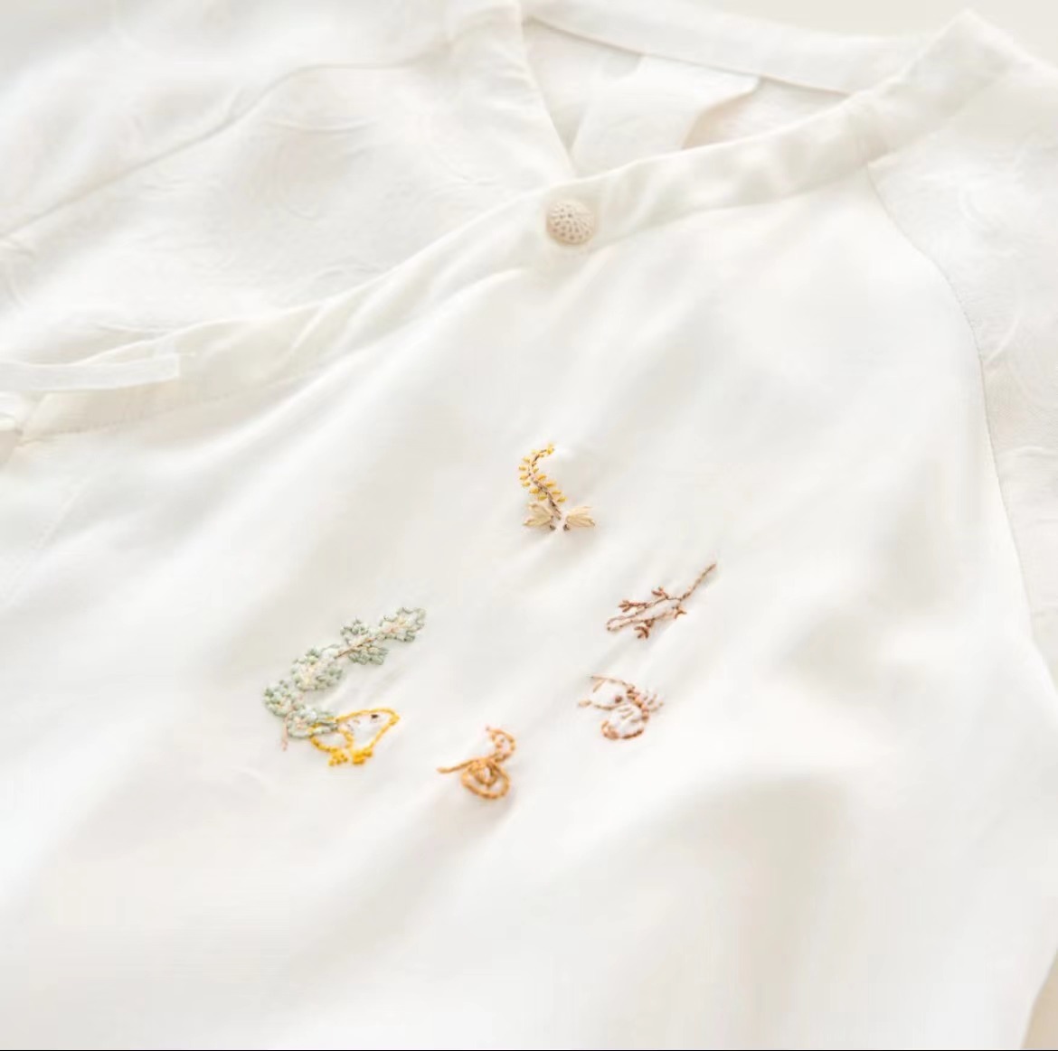 前片:桑蚕丝100%,后片、袖子面料:桑蚕丝100%,贴边:桑蚕丝52.9%,棉47.1%(装饰除外)