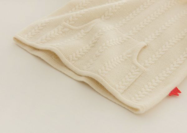 选用不经染色的BABY羊绒,深色是小羊自然生长的紫绒色。挫板针与绞花针法结合编织,是经典的编织方法。