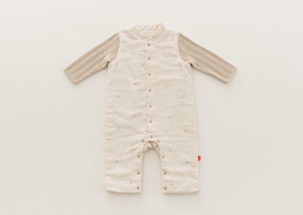 填充了蚕丝绵的棉服,衣身手工绣花,同时也对填充物进行了固定,穿着、水洗之后都不会变形。袖子选用BABY羊绒编织,穿起来更轻松。