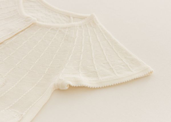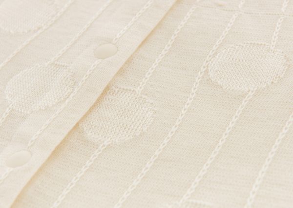 将桑蚕丝与有机棉混合编织,通过“露底提花”工艺做出波点图案。清爽的材质,柔软的针织,夏天舒适穿着。