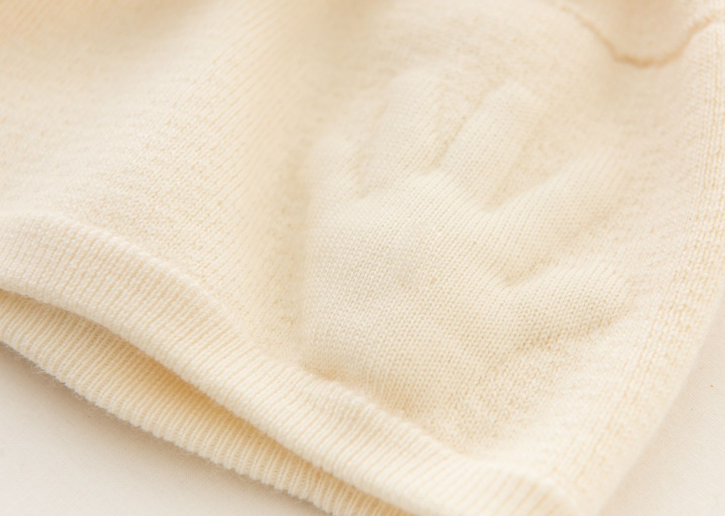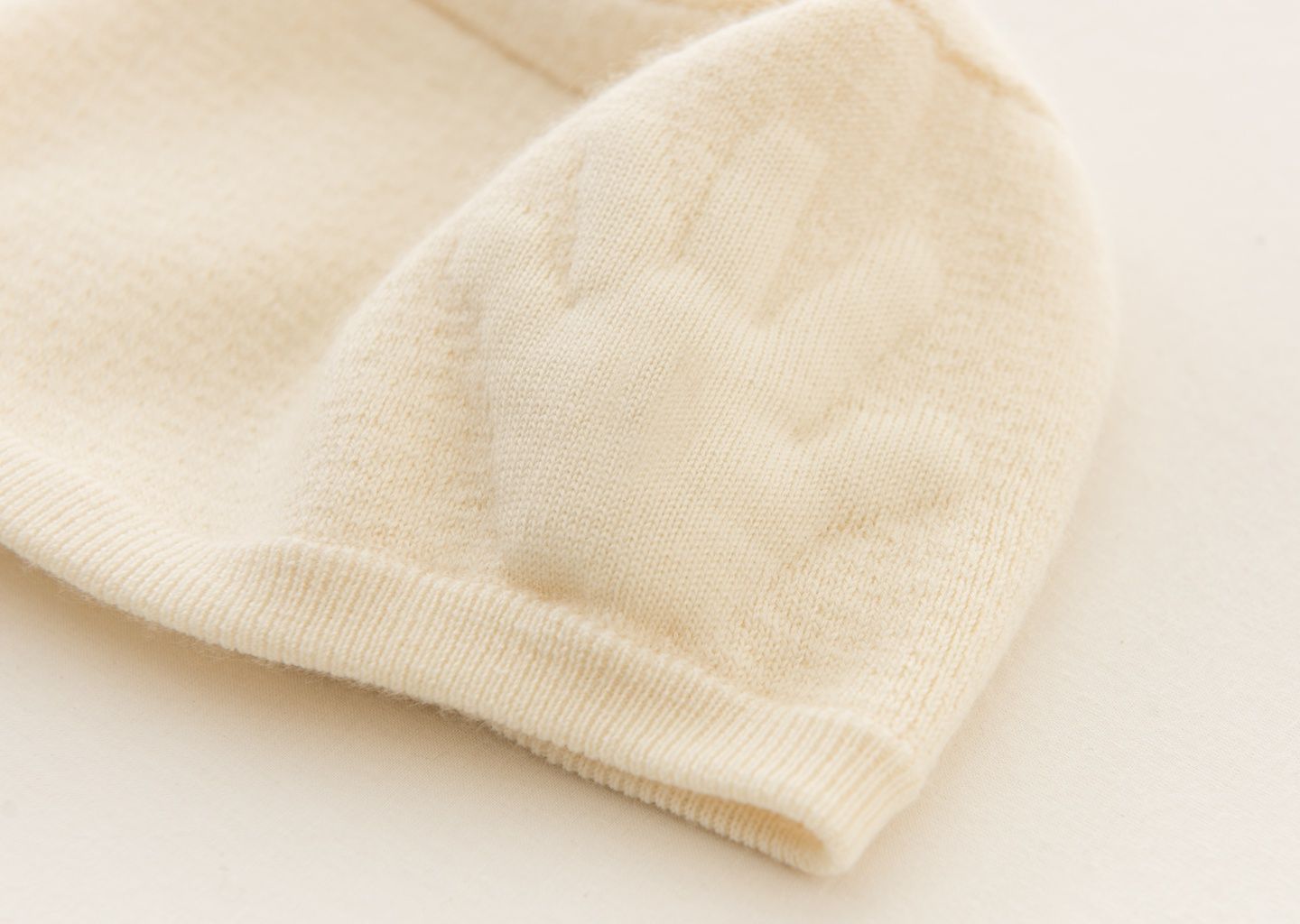 采用羊毛羊绒材质,轻柔保暖,冬季必备。两侧立体小手的设计,寓意着爸爸妈妈的手围绕在宝宝周围,给予宝宝最贴身的守护护。