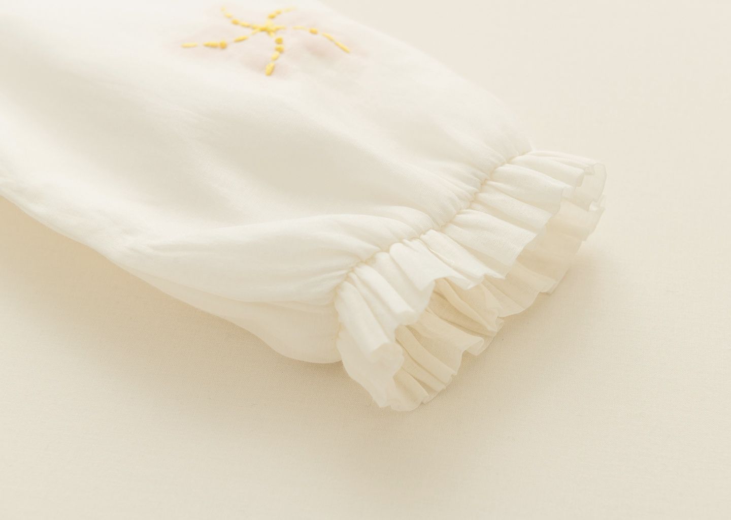 选用丝绵材质的面料,轻盈舒适,厚度适中,春秋皆可穿着。手工绣花和贴布相结合,展现了奇妙的海洋动植物,搭配淡雅的颜色,清新可爱。