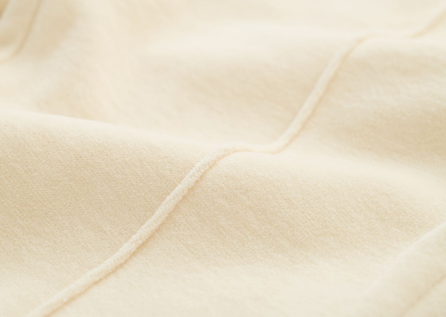 面料选用丝绒质感的有机棉,略微厚实,适合初春穿着。背后用真丝段做贴布装饰,两种材质形成不同的光泽对比,增添了趣味性。