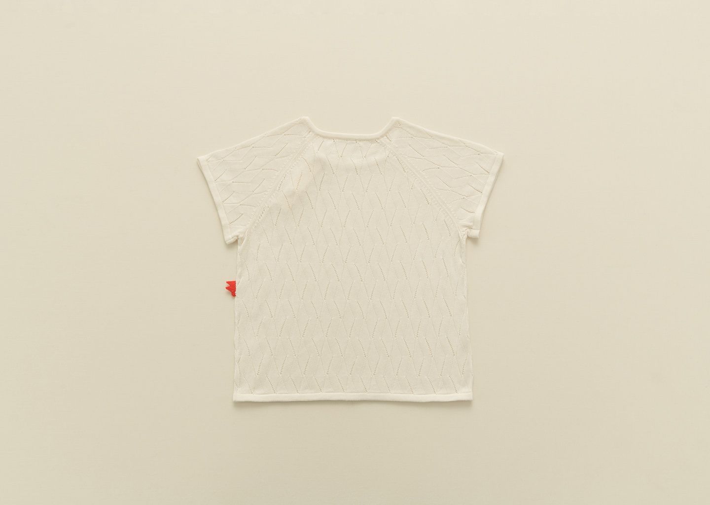 原料上采用富有光泽感的绢丝,使用机器立体编织,模仿海洋抽象的波纹形态,海洋微观的肌理元素,窥见美好,面料亲肤透气,波纹竖条更适合男宝宝穿着。