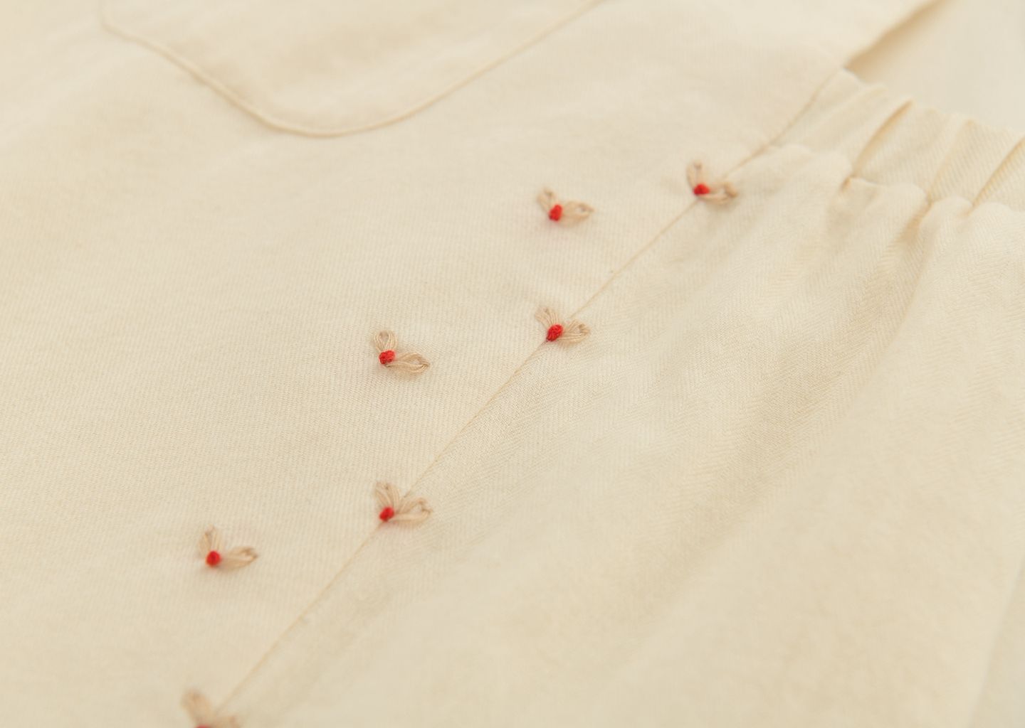 采用不同质感的有纹路面料和斜纹面料做拼接,面料本身质感上的反差也提升了款式的设计感。同时,加入了手工绣花和局部褶皱设计,宝宝穿起来更加的可爱有趣