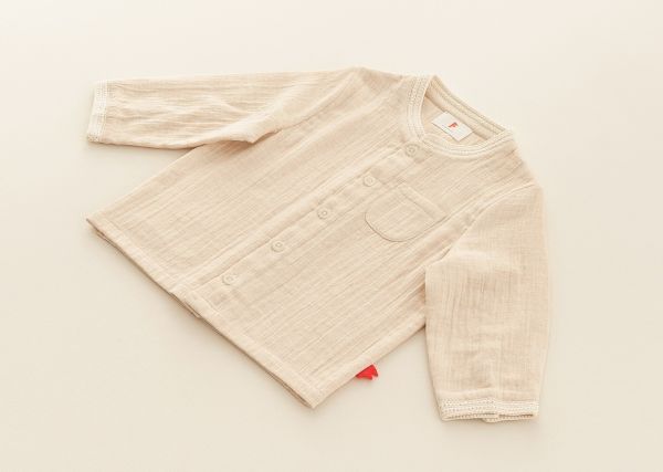 天然成色的有机面料制成,略厚的双层面料适宜春秋季穿着。领部、袖口使用手工钩边。